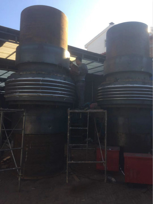 5台直管压力平衡波纹补偿器分为两个公称通径,分别是3台DN1400和2台DN2000,由于DN1400的长度为4500mm,只能需要吊车协助焊工进行焊接制作。以下是5台直管压力平衡波纹补偿器现场制作图片,与您分享一下: