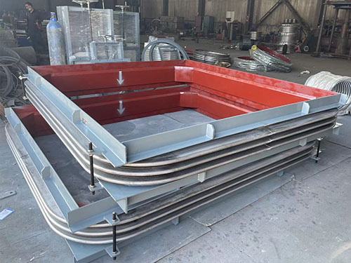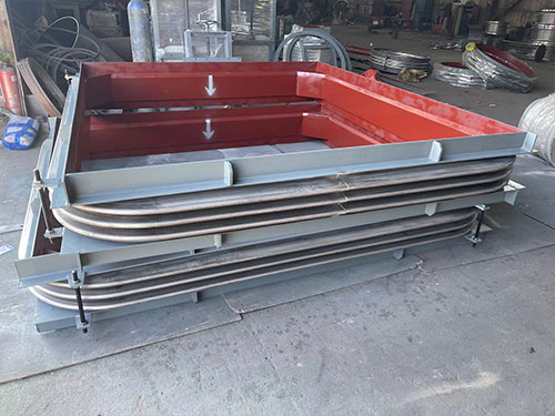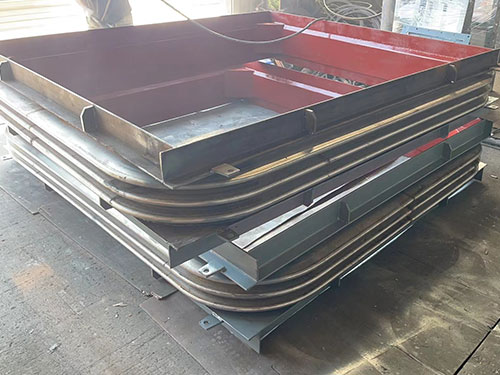 5、矩形圆角波纹膨胀节拐角处圆弧钢板焊装加固,接口以槽钢制做结构件,增强了产品结构刚度,且整体产品线条流畅,外观亮丽。